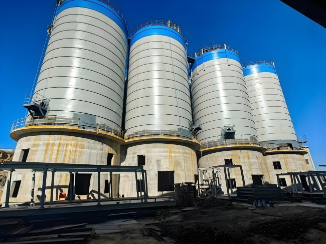 施工阶段需严格把控材料质量与工序精度。钢板选材需满足大荷载需求,仓壁选用 Q390B 或 Q420B 低合金高强度钢板,厚度 10-16mm,仓顶与仓底关键部位采用 Q460C 钢板,厚度 16-20mm,所有钢板表面需做抛丸除锈处理(除锈等级达到 Sa2.5 级),再涂刷两道环氧富锌底漆(干膜厚度≥100μm)与一道氟碳面漆(干膜厚度≥60μm),增强抗腐蚀与抗紫外线能力。卷板施工采用数控大型螺旋卷板机,卷制速度控制在 0.8-1.2m/min,仓壁垂直度误差≤0.8‰,每卷制 5 圈用激光测圆仪校正圆度,偏差不得超过直径的 0.3%;基础施工中,预埋螺栓选用 M30 高强螺栓,位置偏差≤2mm,螺栓外露长度按设计预留 80-100mm,套丝部分涂抹防锈脂并套保护套。